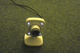| Modified Xbox webcam with four IR LEDs (Photograph using slightly IR sensitive webcam, the four LEDs appear inactive to human eye) |